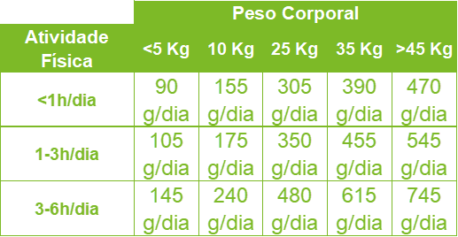 A quantidade de alimento pode variar dependendo da atividade, raça do cão e condições ambientais.