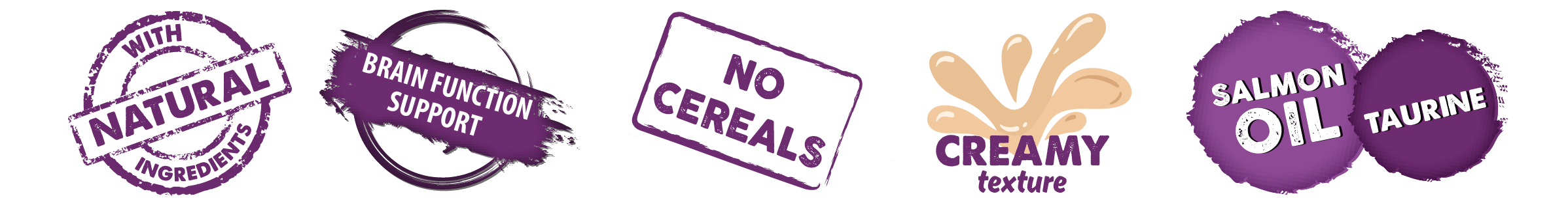 Enriquecido com taurina, óleo de salmão, ómega-3, ómega-6 e DHA, apoia o desenvolvimento cognitivo e a saúde neurológica.